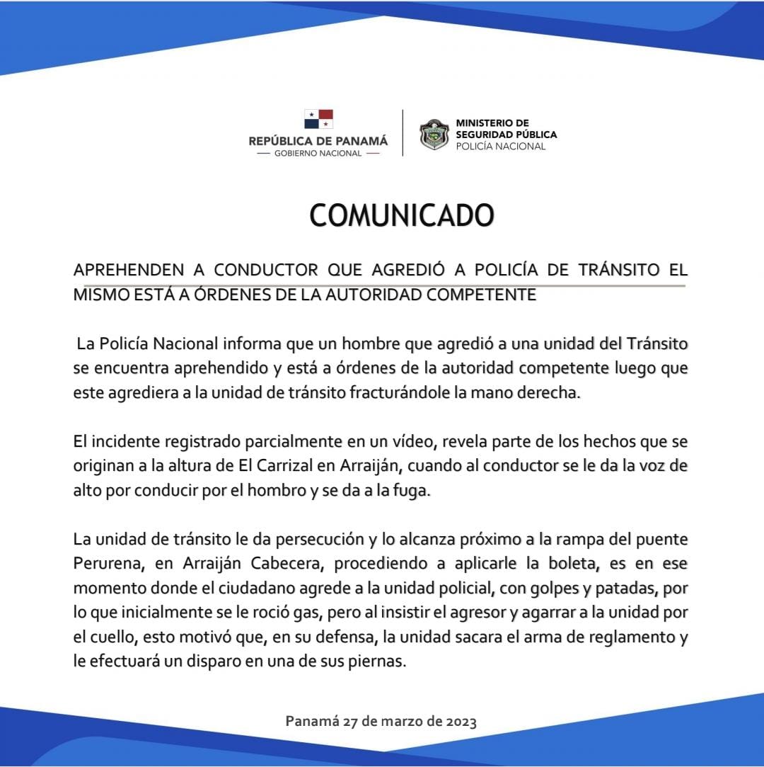 Lunes, 27 de marzo de 2023 a las 6:00 pm a La Policía Nacional informa que un hombre que agredió a una unidad del Tránsito se encuentra aprehendido.... |